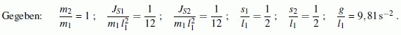 Beispiel 4: Ein Doppelpendel wird definiert durch die beiden Pendelmassen m1 und m2, die auf die jeweiligen Schwerpunkte bezogenen Massenträgheitsmomente JS1 und JS2, die Schwerpunktabstände von den Drehpunkten s1 und s2 und den Abstand l1 der beiden Drehpunkte voneinander.