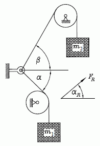 Da die beiden Rollen die Gewichtskräfte m1g und m2g nur in ihrer Richtung umlenken, kann die Resultierende FR aus der Kraft m1g unter dem Winkel α zur Horizontalen und der Kraft m2g unter β zur Horizontalen bestimmt werden. Bei der Eingabe der Werte ist zu beachten, dass α entsprechend der vereinbarten Winkeldefinition mit einem Minuszeichen einzugeben ist.