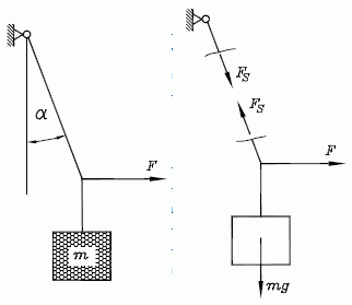 Beispiel 2: (Aufgabe entnommen aus dem Kapitel "Das zentrale ebene Kraftsystem" des Lehrbuchs "Dankert/Dankert: Technische Mechanik") Wie groß muss die an dem masselosen Seil horizontal angreifende Kraft F sein, um das durch die Masse m belastete Seil in der skizzierten Lage zu halten?