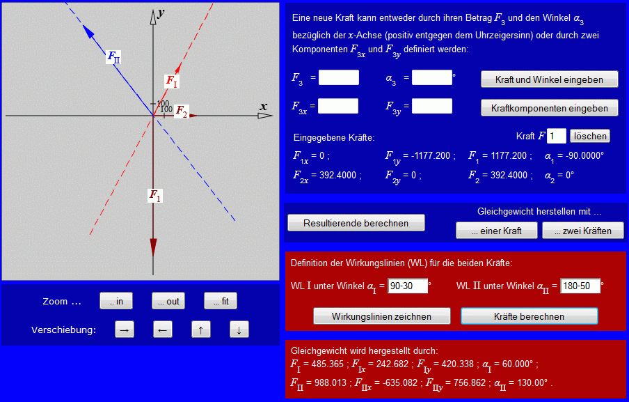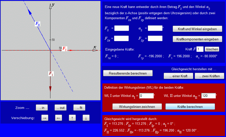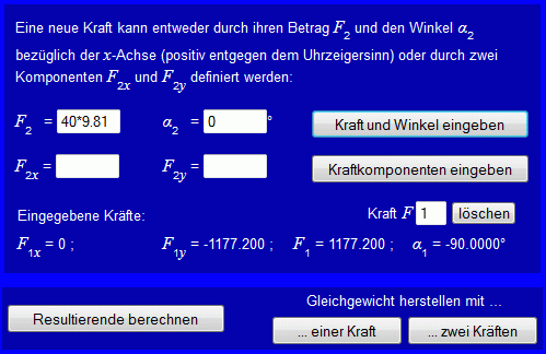 Die Gewichtskraft kann entweder als F1 = 20*9.81 und α1 = −90° in die obere Eingabezeile oder als F1x = 0 und F1y = −20*9.81 in die untere Eingabezeile eingegeben werden. Folgende Schritte werden ausgeführt: