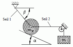 Beispiel 3: Eine Walze mit der Masse mW liegt auf einer schiefen Ebene und wird durch ein Seil 1 gehalten. Sie ist durch ihr Eigengewicht und über das Seil 2 durch die Gewichtskraft der Masse m belastet.