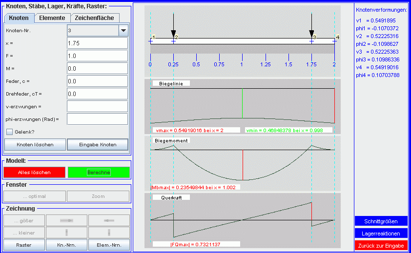 Knotenabsenkungen v und die Biegewinkel φ an den Knoten werden gelistet: