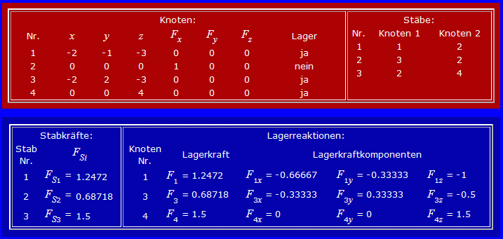 Das eingegebene Modell wird zusätzlich zur Grafik auch in einer Tabelle protokolliert. Weil beide Informationen bestätigen, dass die Eingabe dem zu berechnenden Problem entspricht, kann auf "Berechnung starten" geklickt werden. Nachfolgend sieht man das protokollierte Modell und die berechneten Ergebnisse: