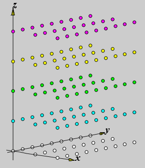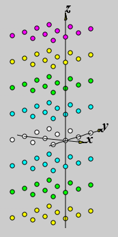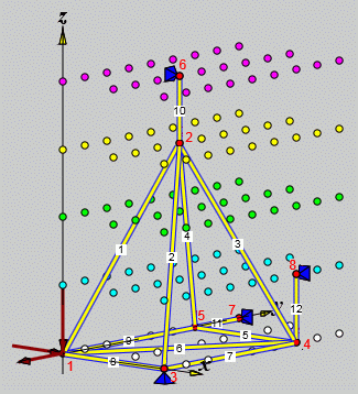 Nach Anklicken des Buttons "Werte übernehmen" sieht die Zeichenfläche so aus, wie sie unten links zu sehen ist. Die Zuordnung der Rasterpunkte zu den markanten Punkten der Aufgabenstellung ist klar zu erkennen: Die beiden Lager in der Wand liegen in der "gelben z-Ebene", der Kraftangriffspunkt ist der Ursprung des Koordinatensystems in der "weißen z-Ebene", das obere Lager liegt in der "violetten z-Ebene". Nach Anklicken von "Stäbe definieren" können nacheinander die drei Stäbe durch Klick auf die entsprechenden Rasterpunkte definiert werden (vorsichtshalber sollte man immer die oben links angezeigten Mauskoordinaten verfolgen).