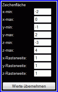 Wenn das Koordinatensystem aus der Skizze zur Aufgabenstellung übernommen wird, werden für die Zeichenfläche sinnvollerweise die links zu sehenden Werte eingestellt.