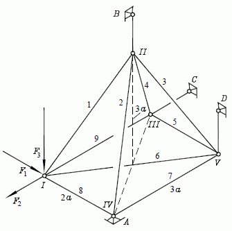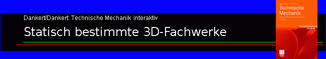Das Fachwerk ist durch drei Stäbe (einwertige Lager) bei B, C und D gelagert und im Punkt A durch ein räumliches Festlager (kann drei Kraftkomponenten aufnehmen) abgestützt. An einer Ecke des Fachwerkes werden die Kräfte F1, F2 und F3 eingeleitet.