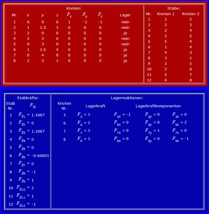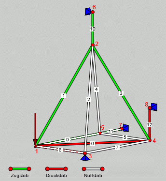 Das Grafikfeld unterstützt die Interpretation der Ergebnisse, indem Zug-, Druck- und Nullstäbe unterschiedlich eingefärbt werden. Das nebenstehende Bild lässt die Durchleitung der Belastung recht deutlich erkennen: Die Kraft in x-Richtung wird über den Druckstab 8 zum Festlager am Punkt 3 abgetragen, die Kraft in y-Richtung über die Zugstäbe 9 und 11 zum Lager am Punkt 7. Nur die vertikal gerichtete Kraft belastet die Stäbe 1, 6 und 3 (und die Lagerstäbe 10 und 12) wie ein ebenes Fachwerk. Um diese Überlegung zu bestätigen, wird noch einmal gerechnet: