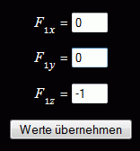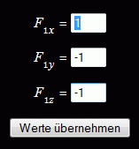 Das Angebot wird angenommen, und man sieht die drei Kraftkomponenten am Knoten 1 (mittleres Bild), die geändert werden (rechtes Bild). Nach Anklicken von "Werte übernehmen" sieht man am Knoten 1 nur noch eine Kraft.