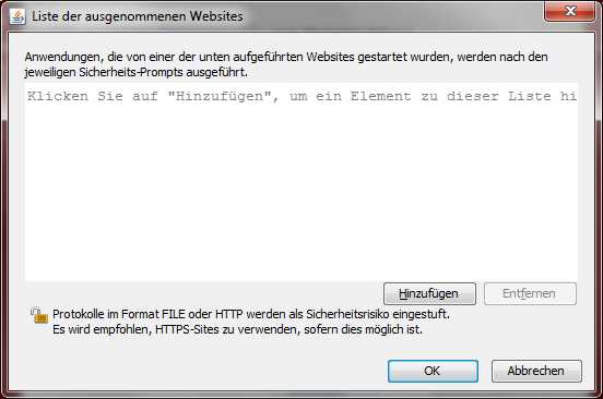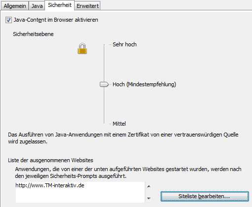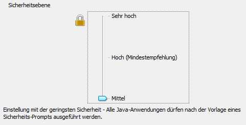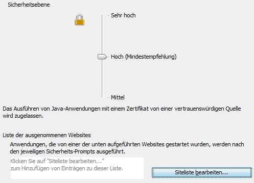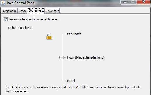 Unter Start|Systemsteuerung findet man das Angebot "Java" (Microsoft versteckt dies gern, so dass man im kleinen Fenster "Systemsteuerung durchsuchen" nach dem Stichwort "Java" erst suchen muss). Nach Doppelklick öffnet sich das "Java Control Panel". Auf der Karteikarte "Sicherheit" sieht man die Standardeinstellung: