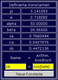 Weil auch die Winkelfunktionen mehrfach vorkommen, werden auch dafür einfache Abkürzungen eingeführt (z. B. sa für sin α und cb für cos β). Die Abbildung rechts zeigt das Fenster mit den bereits definierten Konstanten und den beiden Eingabefeldern, die für die Definition von cb vorbereitet sind, die mit Klicken auf "Neue Konstante" abgeschlossen wird. Man sieht, dass die (vorab) definierten Konstanten (hier wird beta verwendet) bei nachfolgenden Definitionen in den arithmetischen Ausdrücken verwendet werden dürfen.