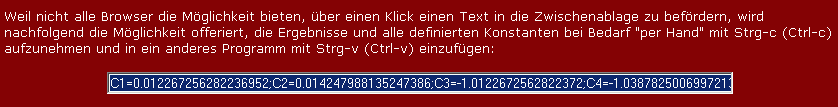 Nun soll noch gezeigt werden, wie diese Ergebnisse in das Programm "TM-Mathe-Rechner (Funktionen analysieren)" übernommen werden können, um dort die Biegelinie grafisch darzustellen. Unterhalb der Anzeige der Ergebnisse findet man ein Feld mit den kompakt angeordneten Ergebnissen und den definierten Konstanten: