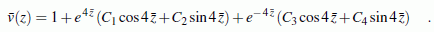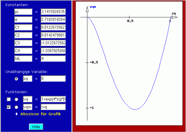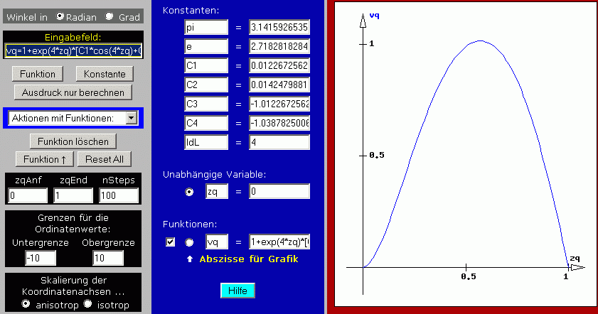 Diese Funktion wird grafisch dargestellt, indem zunächst die unabhängige Variable auf zq ("z-quer") umgestellt und danach die Funktion vq=1+exp(4*zq)*[C1*cos(4*zq)+C2*sin(4*zq)]+exp(-4*zq)*[C3*cos(4*zq)+C4*sin(4*zq)] eingegeben wird. Die Grenzen für die grafische Darstellung werden auf zqAnf=0 bzw. zqEnd=1 eingestellt. Nach Wahl von "Grafische Darstellung" in der Auswahlbox "Aktionen mit Funktionen" sieht der Bildschirm so aus: