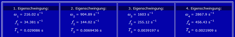 Zum Vergleich: Die recht aufwendige exakte Lösung wird hier demonstriert. Für die ersten drei Eigenfrequenzen findet man dort: f1 = 34,381 s−1, f2 = 144,01 s−1, f3 = 255,08 s−1.