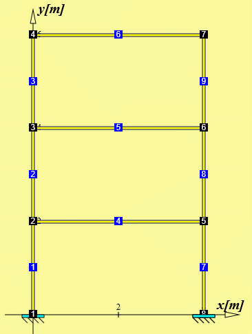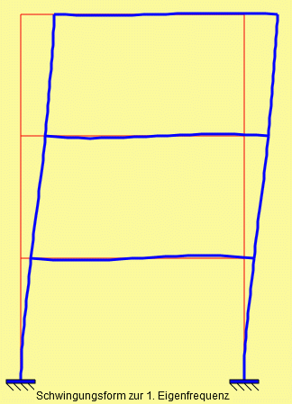 Für solche Systeme ist eine Starrkörperbewegung möglich, die sich bei der Eigenschwingungsberechnung durch mindestens eine Eigenkreisfrequenz ω = 0 bemerkbar macht. Diese "Schwingungen" werden vom Programm aussortiert, deshalb wird als Grundfrequenz für den Rahmen die zur nebenstehend zu sehenden Schwingungsform gehörende Frequenz ausgewiesen.