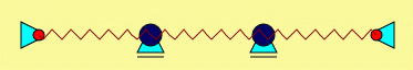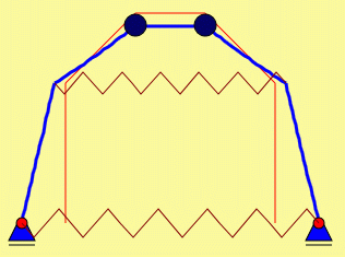 berechnet werden. Rechts sieht man das Modell, das mit dem hier verfügbaren Programm erzeugt wurde: 2 Knotenmassen, 3 Federelemente und 4 Lager. Man kann das Modell mit Klick auf den folgenden Button laden und im Grafikbereich oben die Schwingung verfolgen.