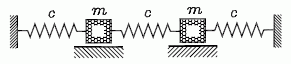 Beispiel 4: Mit dem Programm können auch Feder-Masse-Schwinger berechnet werden. Nebenstehend sieht man einen einfachen Zwei-Massen-Schwinger, für den im Kapitel "Systeme mit mehreren Freiheitsgraden" des Lehrbuchs "Dankert/Dankert: Technische Mechanik" für die beiden Eigenkreisfrequenzen die exakten Werte