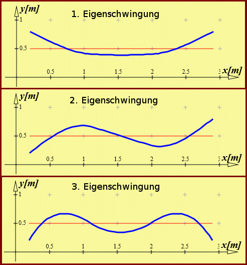 Die mit 14 Elementen berechneten Frequenzen sind praktisch exakt, damit auch die zugehörigen Schwingungsformen. Nebenstehend sieht man die zu den ersten drei Eigenfrequenzen gehörenden Schwingungsformen.